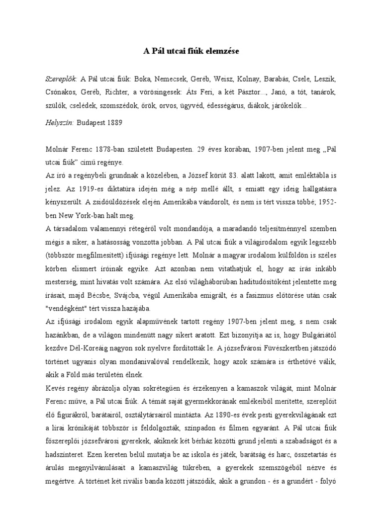 Ingyen Letoltheto Konyvek Hangoskonyvek Molnar Ferenc A Pal Utcai Fiuk Olvasonaplo A Pal Utcai Fiuk Molnar Ferenc 1907 Ben Megjelent Ifjusagi Regenye A Tortenet 1889 Marciusaban Budapesten Jatszodik A Pal Utcai Fiuk