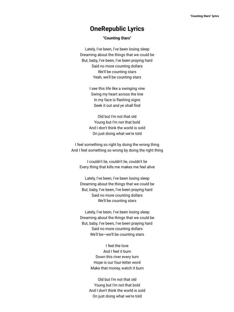 Onerepublic Counting Stars Lyrics Azlyrics Com Pdf Song Recordings Produced Songs Written